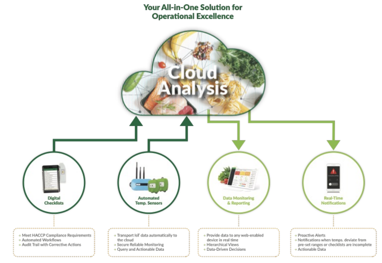 In the event the monitoring system detects a change in temperature or the ambient environment, it triggers real-time alerts, which are sent to a preferred device via text, email, or call. Information is also sent to a central cloud-based database, which can be accessed from any web-enabled device to ensure food safety and regulatory compliance.