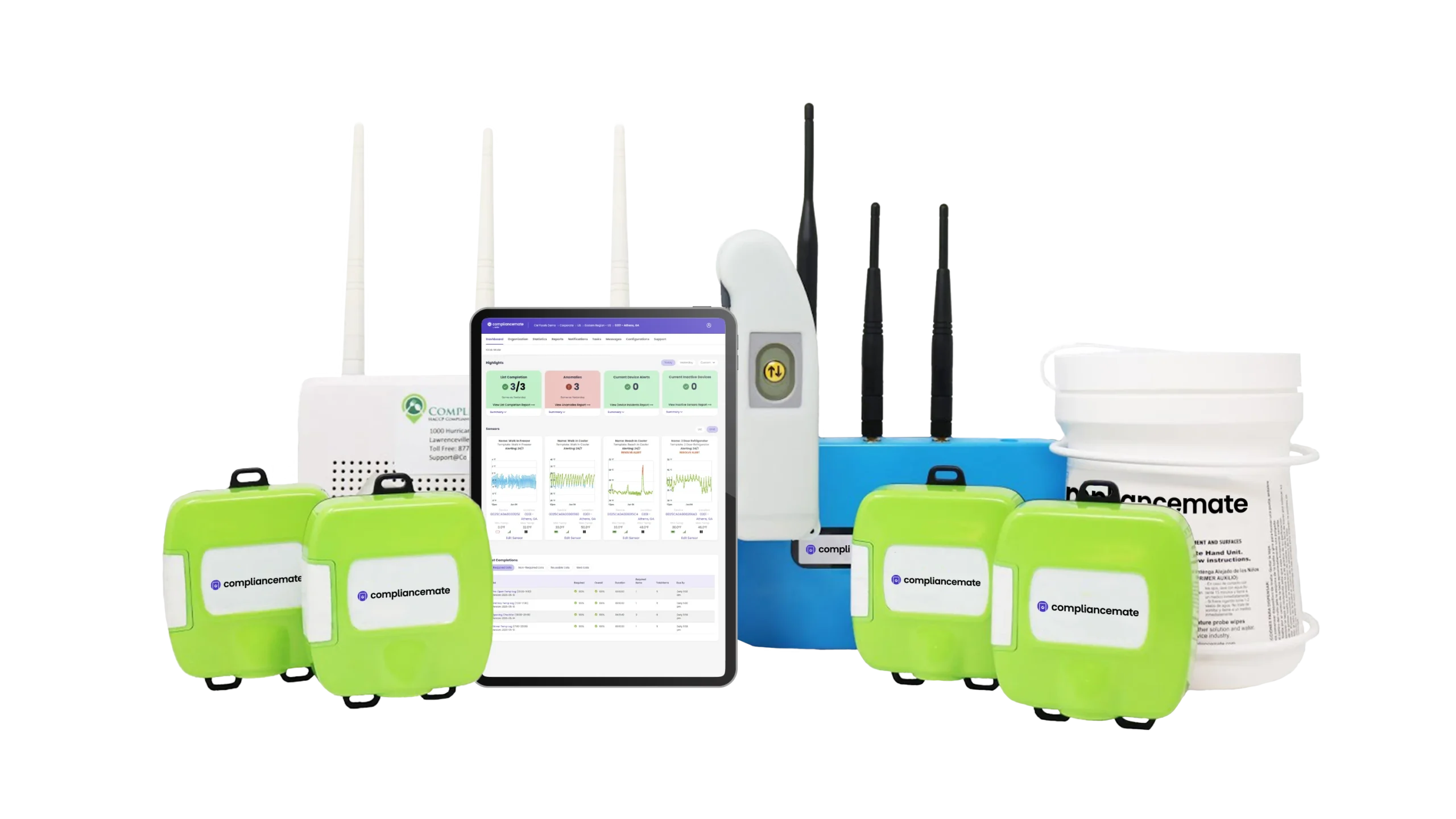 The ComplianceMate monitoring system includes several key components that together, ensure regular monitoring and food safety at all kinds of public hospitality venues.